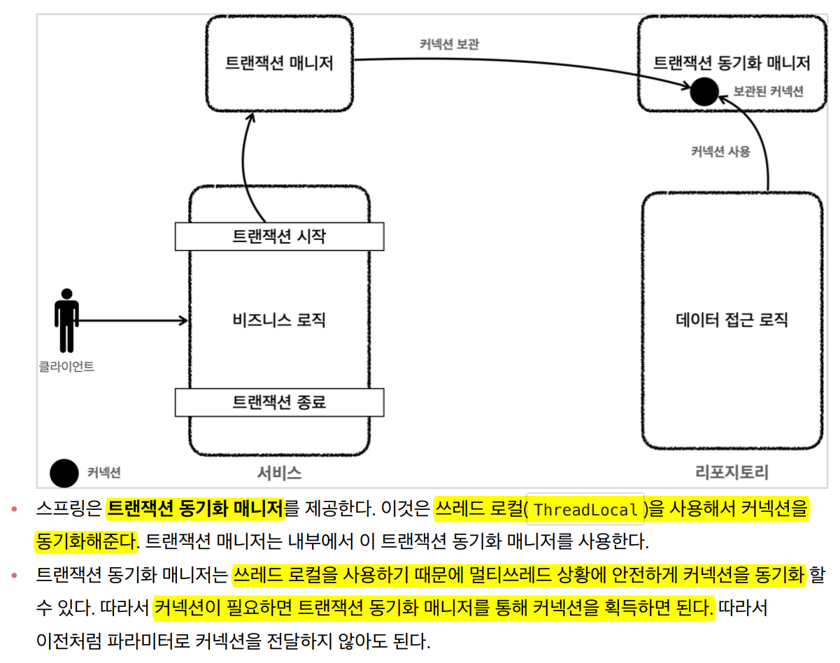 트랜잭션 동기화 매니저는 멀티쓰레드 상황에서도 커넥션을 안전하게 보관해주는구나 이해.