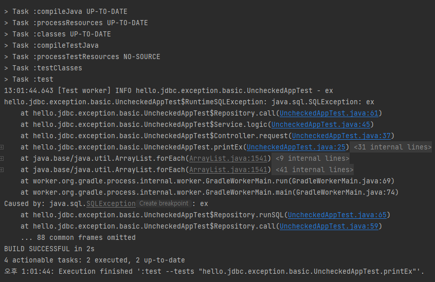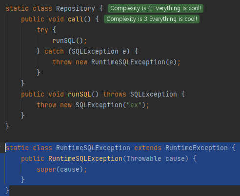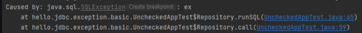 throw new RuntimeSQLException(e); 에서 e를 넣어주었기 때문에 로그에서 SQLException도 찍힌다.
