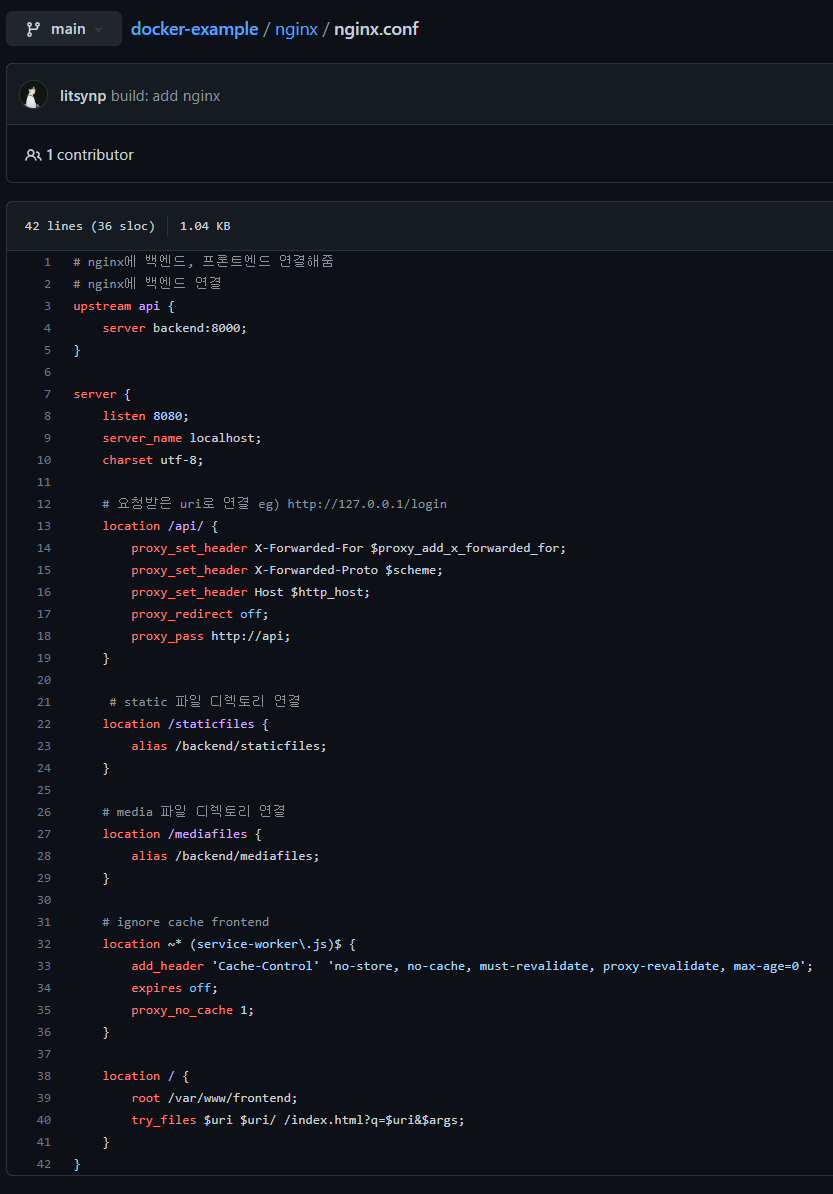 왜 backend라 되어있지? : nginx가 인식할 수 있나? -> dockercompose에 작성된 도커컨테이너(db끼리, fe끼리, be끼리) 끼리는 컨테이너에 서비스이름으로 접근 할 수 있다. backend만 적으면 backend에 접근할 수 있다.