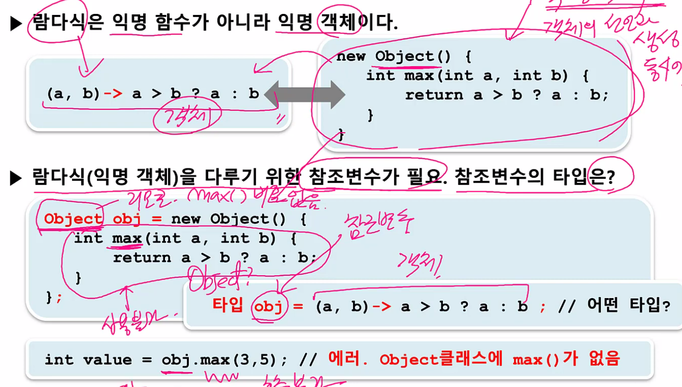 람다식은 new Object() 로 표현할 수 있다. 하지만 Object의 메서드는 아니므로 obj.max는 접근 불가